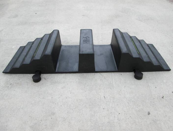 The MGF-0235 Hose and Cable Ramp is a moulded rubber hose ramp designed to protect 2 x 125mm diameter hoses. The part has two open top channels. Each channel is 135mm at the base opening up to 140mm at the top. The depth of each channel is 120mm. Each face of the ramp has three yellow visibility strips embedded into slots. The ramp is supplied with 2 connecting connectors fitted. Spares are available if required.