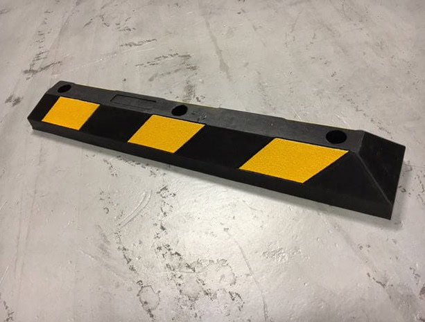 The MGF-0086 Kerb is a medium, high visibility, rubber kerb for car and light goods vehicle parks. They work especially well , one per parking bay, in front of buildings to avoid damage to either the vehicle or the building. Can be fixed into concrete with three M12 x 100 anchor fixings (MGF-0341) or three M12 tarmac fixings (MGF-0261).